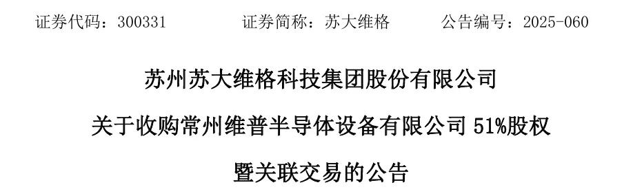 近日,苏大维格(维权)(证券代码:300331.SZ)公告称,拟以自有或自筹资金5.1亿元收购常州维普半导体设备有限公司(简称“常州维普”)51%股权。
